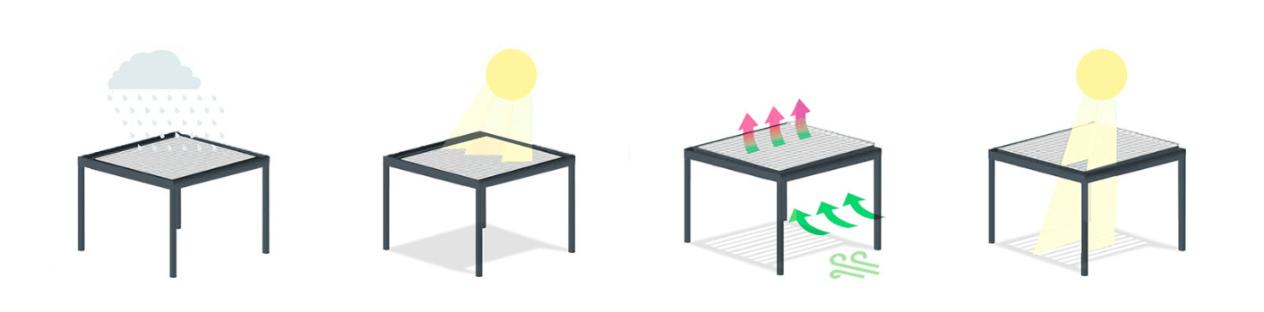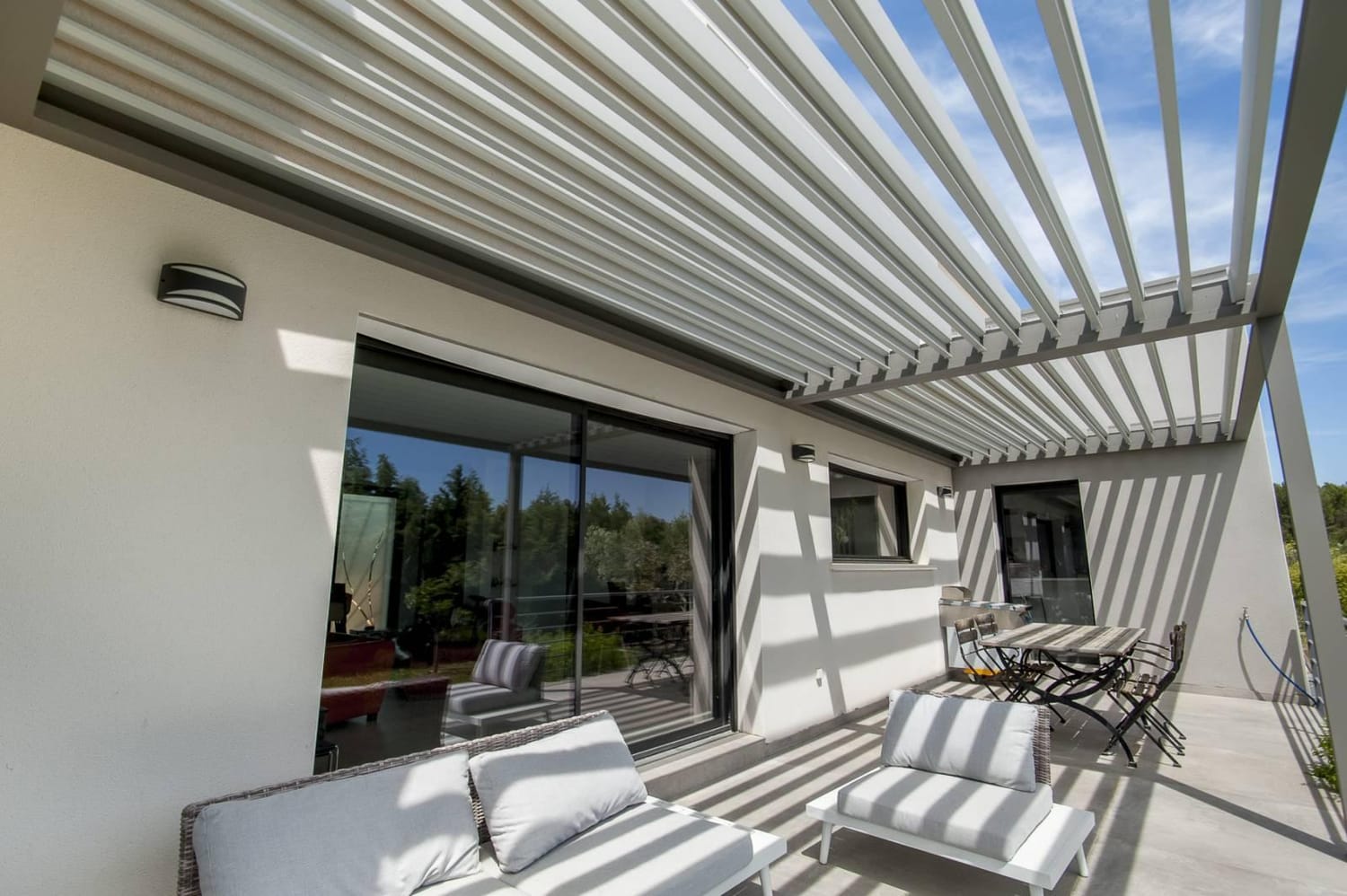 Grâce à ses lames orientables, la pergola bioclimatique régule l'ensoleillement, la ventilation et la protection contre la pluie.
